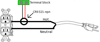 Since I didn't wanna pull apart my sump pump, I made an outlet in which I can plug the sump pump in. The outlet has a power cord and plugs into any other outlet. My special outlet has a terminal block on it that breaks out the sensor's red and black wire. I didn't take any pictures of the inside of the box but it basically looks something like this: