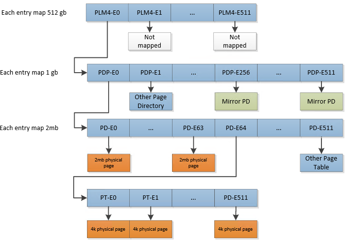 - The first 128mb is identity mapped using 2mb pages (first 64 page directory entries).
